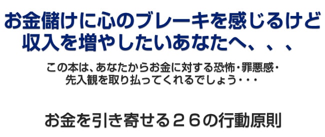 この本を読んだからと言って、スグに成功する、、、なんて事はお約束できません。しかし、約束できるのは、この本を読み終わった後は、あなたのお金に対する考え方、お金に対する罪悪感、幼い頃から植え込まれたお金の先入観などは全く違うものに変わっているでしょう。