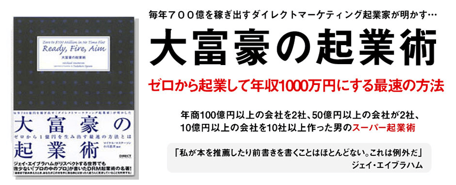 年商100億円以上の会社を2社、50億円以上の会社が2社、10億円以上の会社を10社以上保有、ダイレクト・レスポンス・マーケティングの世界で屈指の実積を誇るスーパー起業家。