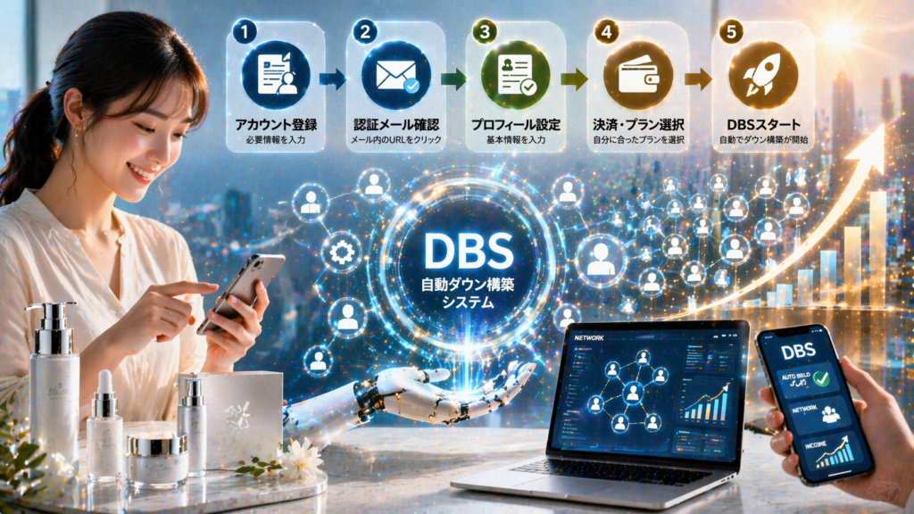 DBS(自動ダウン構築システム)は、これまで手作業で行っていた集客や教育、登録までの流れを仕組み化し、自動でダウン(組織)を構築していくシステムです。