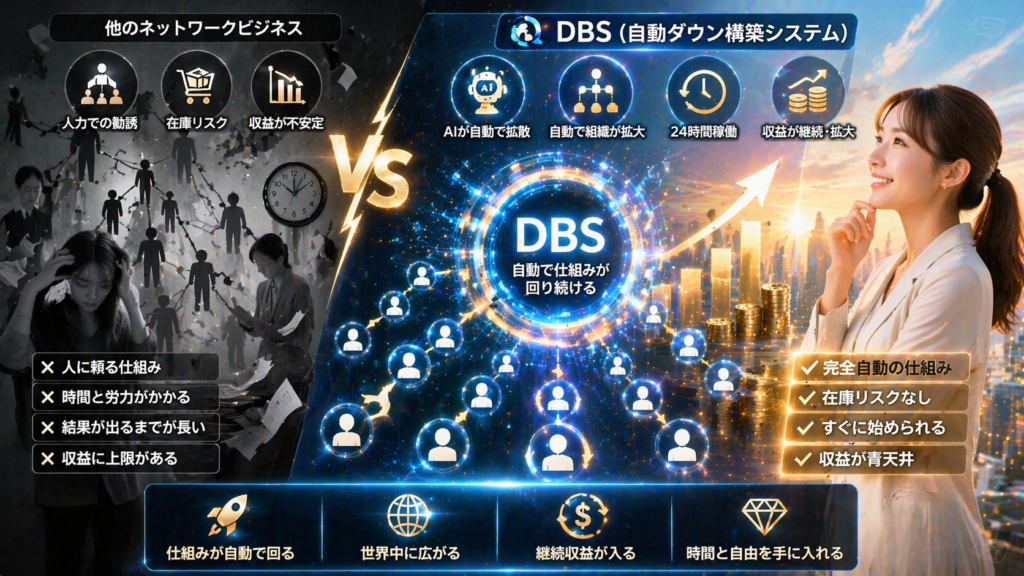 DBS(自動ダウン構築システム)を活用することで、これまで難しかった集客やダウン構築を自動化し、営業や勧誘に依存しない形で組織を拡大することが可能になります。