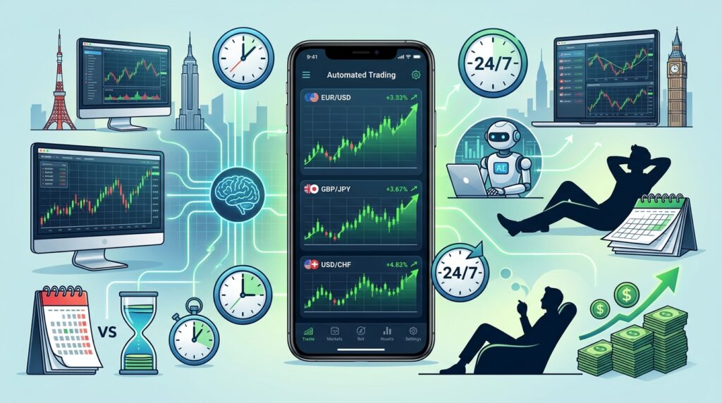 つまり、あなたが仕事をしている間や寝ている間でも、自動売買システムが市場を分析し、トレードを行ってくれます。
